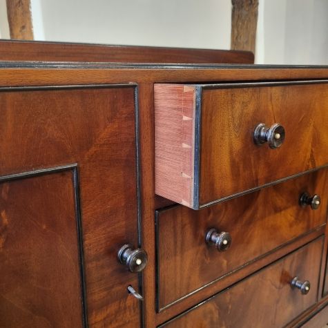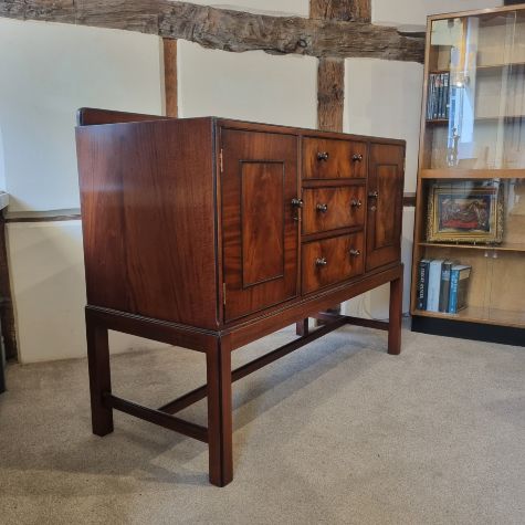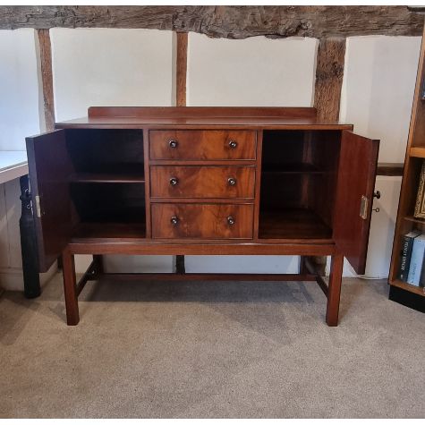 Description: This finely crafted mahogany sideboard from the late 1920s, made by Heals of London, showcases exceptional workmanship with features such as dovetailed drawers, turned ebony knobs, ivorine inset buttons, and decorative ebony beading; its cabinet doors are decorated with well chosen figured mahogany and secured by original locks and keys, while the piece has been carefully refinished to maintain both its functionality and aesthetic appeal for modern homes. As you would expect from Heals, a timeless and attractive sideboard. Measurements - 50 cm deep x 97 cm high x 123 cm wide.