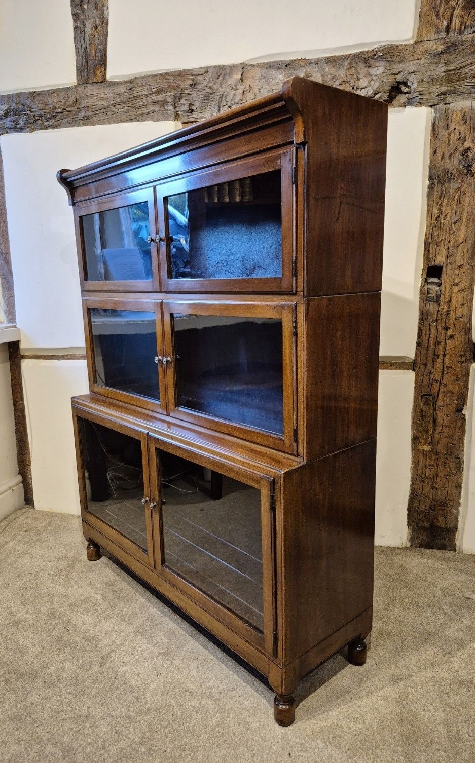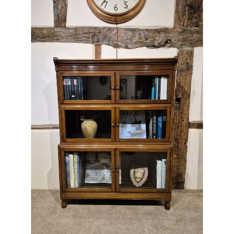 Description: Minty of Oxford, the makers of this antique three-tier glazed mahogany bookcase, have a long-established history of crafting high quality office furniture for solicitors, lawyers and companies across the globe. However, these stylish bookcases have increasing found their way into the home, because their simple uniform outlines and lack of decorative exuberance sits comfortably within today's interiors. This example particularly appealed to me, because, not only was it in good original condition, with a base-section that boasts plenty of depth to house larger books, but, it also has a very attractive surface - its once deep and rich mahogany surround has, over the last 100 years, transformed into a mellow and appealing range of soft warm tones. Now, after being carefully restored, taking great care not to disturb its patina, this bookcase is ready to be used and enjoyed once more. Measurements - 89 cm wide x 30 cm deep x 118 cm high