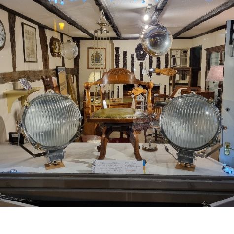 Description: This impressive pair of floodlights are reputedly from the equally impressive mid-19th Century waterworks at Hampton, "having lived for several years within a short walk of the pump houses on the banks of the Thames, I remember marvelling at the architecture and the quality of their construction." Thankfully, after years of neglect, these listed buildings are now being painstakingly conserved. Unlike many of the imported reproduction floodlights available on the market, these are original, and date to the 1930s, and, as you can see from the images, they are beautifully constructed, using top-quality materials, including steel, copper and gunmetal. Now, after a complete restoration, they are once again in working order, "I think these wonderful lights would look great in many different settings, but personally, I see them in a showroom, spotlighting some classic cars." Measurements are approximate and do not take into consideration the steel hanging brackets - 70 cm high x 60 cm wide x 30 cm deep.