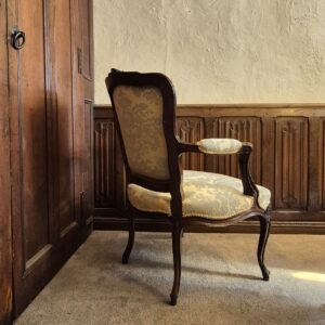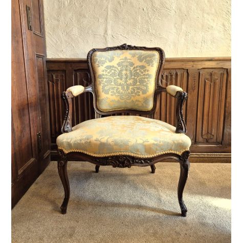 Description: This antique French walnut armchair or fauteuil (Circa 1900) was acquired by Culvertons, because we felt it was particularly attractive, finely carved and in a very good useable condition. In fact it is one of two such armchairs we have recently brought into stock from the same private source. The other, which is being sold separately, and can be also viewed via Culvertons online shop, is of a similar age and size, and also traditionally upholstered in the same fine light gold and duck egg blue Damask fabric, however their carved walnut show frames do differ. Each has a feather filled throw cushion. There are two minor marks on the upholstery of this example (see photos) - one on the left-hand side of the seat and the other on the cushion. The cushion cover has a zip so it can be removed for cleaning. An elegant and comfortable armchair that is ready to be used and enjoyed either singly or as matching pair. Please contact us if you would like to purchase both chairs. Measurements - 67 cm wide x 90 cm high x 60 cm deep -
