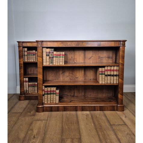 Description: This fine pair of open walnut bookcases, have been made, to not only house a substantial number of varying sized books on their adjustable shelves, but to also showcase the natural beauty and warmth of figured walnut, which has been further enhanced after being professionally restored. Sourced from a private client in Surrey, these attractive bookcases are available as a pair or singularly, as we are conscious of the lack of space in many contemporary homes. Whether you purchase one, or both, these bookcases will enrich a period or contemporary interior. Measurements of each bookcase - 125 cm wide x 102 cm high x 29 cm deep (depth of shelves- 22cm).