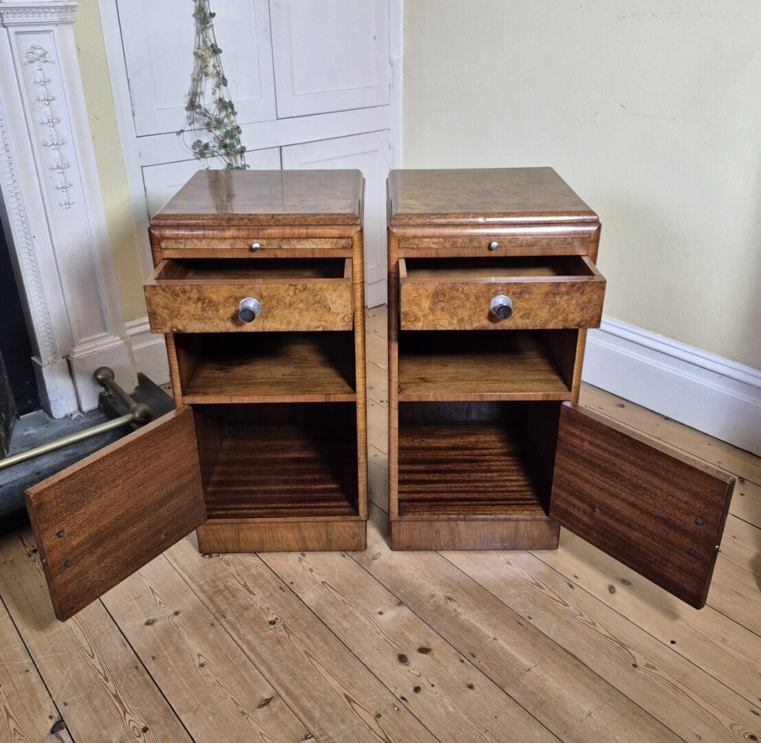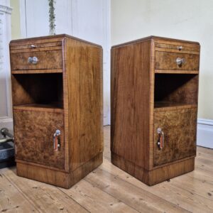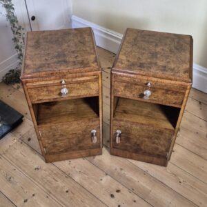 Description: This pair of original Art Deco bedside cabinets, decorated in burr and figured walnut with super Bakelite and chrome handles, perfectly evoke this period synonymous with opulence and style that spanned the 1920s and 30s. It has become one of the most recognisable and influential design styles; portrayed so vividly within P G Wodehouse's Jeeves and Wooster novels. A hundred years have passed but their appeal has not diminished; these chic cabinets will enhance contemporary as well as period homes and apartments. The burr walnut veneer, which has now been traditionally re-polished; has a subtle mirror-like quality. Elements of the original and very distinctive drawer and door handles have been re-plated. The small chrome knobs on the pull-out slides and the door hinges are sympathetic replacements. The mahogany lined draws constructed using finely cut dovetail joints are in excellent condition. There is a small area of discoloured walnut veneer inside the open storage area to one of the cabinets. A historic perfume spillage (please see image) would account for this; however, I prefer to see the mark, which reflects the cabinet’s age and use, rather than the effect of harsh restoration. We have ordered two pieces of glass with polished edges which will protect their decorative walnut tops. A lovely pair of bedside cabinets from a period that is a firm favourite of mine. Measurements 38 cm deep x 36 cm wide x 72 cm high.