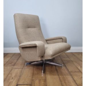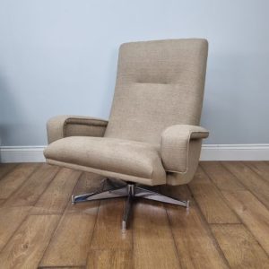 Description: This pair of stylish Howard Keith armchairs were sourced from a country house in the Guildford area. They date to the middle of the 20th Century, and we have completely re-upholstered them to a high-standard in a complimentary neutral fabric, that is both restful and hardwearing. They are very comfortable, supportive and in lovely condition. A super pair of revolving armchairs by a sought after maker. Images of the chairs prior to re-upholstery are available on request. Measurements - 98 cm high x 85 cm wide x 88 cm deep.