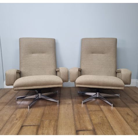 Description: This pair of stylish Howard Keith armchairs were sourced from a country house in the Guildford area. They date to the middle of the 20th Century, and we have completely re-upholstered them to a high-standard in a complimentary neutral fabric, that is both restful and hardwearing. They are very comfortable, supportive and in lovely condition. A super pair of revolving armchairs by a sought after maker. Images of the chairs prior to re-upholstery are available on request. Measurements - 98 cm high x 85 cm wide x 88 cm deep.