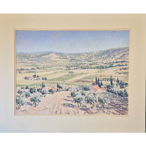Description: Provence, in the south-eastern region of France is known for its sun-drenched lavender and olive groves, and this original signed pastel by Lionel Aggett beautifully captures the landscape. Lionel Aggett (1938 - 2009) was a landscape painter, muralist, architect and writer. He was born in Whiddon Down, Devon and educated at Exeter School. Looking through recently sold artworks by this artist, his drawings of the French countryside in pastel appear to be the most popular and are starting to command steady and respectable sums when they come on the market. His artistic training and command of this medium is plain to see. Lionel was an artist who could convey distance and perspective with ease and transport the viewer to this much-loved area of France - you can almost feel the heat and hear the rhythmic buzz of the cicadas. Here are the measurements of the frame - 57 cm high x 69 cm wide and the art work itself measures approx. 37.5 cm high x 50 cm wide.