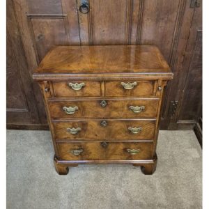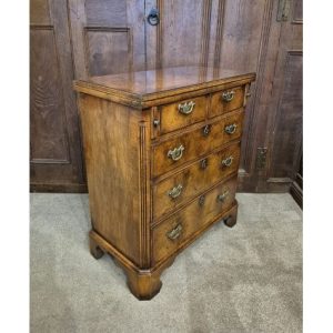 Description: This walnut bachelors chest of drawers is particularly attractive and was made in the last 35 years by Arthur Brett, the renowned Norfolk based cabinet makers. It is a faithful copy of the antique. The original, which is very rare, was made in the early 18th Century (Queen Anne period - 1702-1714). As a lifelong dealer in antique furniture, its a piece I have always hoped to find, however, this lovely well observed reproduction is still a joy to own. Overall this chest is in excellent condition and retains an appealing surface colour. Measurements (top close) - 65 cm wide x 35 cm deep x 76 cm high.