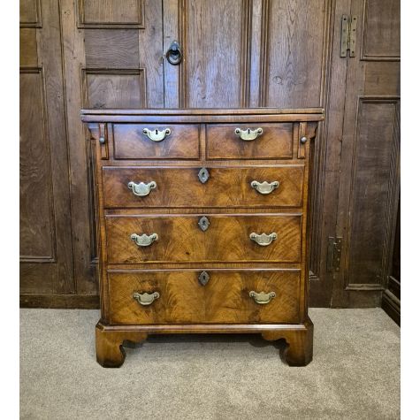 Description: This walnut bachelors chest of drawers is particularly attractive and was made in the last 35 years by Arthur Brett, the renowned Norfolk based cabinet makers. It is a faithful copy of the antique. The original, which is very rare, was made in the early 18th Century (Queen Anne period - 1702-1714). As a lifelong dealer in antique furniture, its a piece I have always hoped to find, however, this lovely well observed reproduction is still a joy to own. Overall this chest is in excellent condition and retains an appealing surface colour. Measurements (top close) - 65 cm wide x 35 cm deep x 76 cm high.